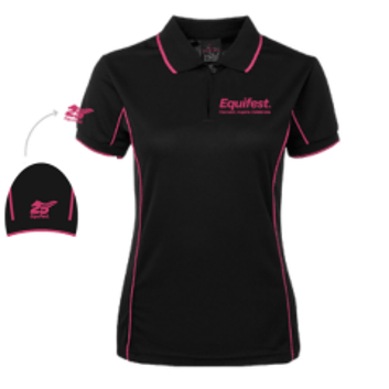 Equifest PoloClassic fit; 100% Polyester, moisture wicking fabric designed to help keep you cool and dry. Ladies style features.
